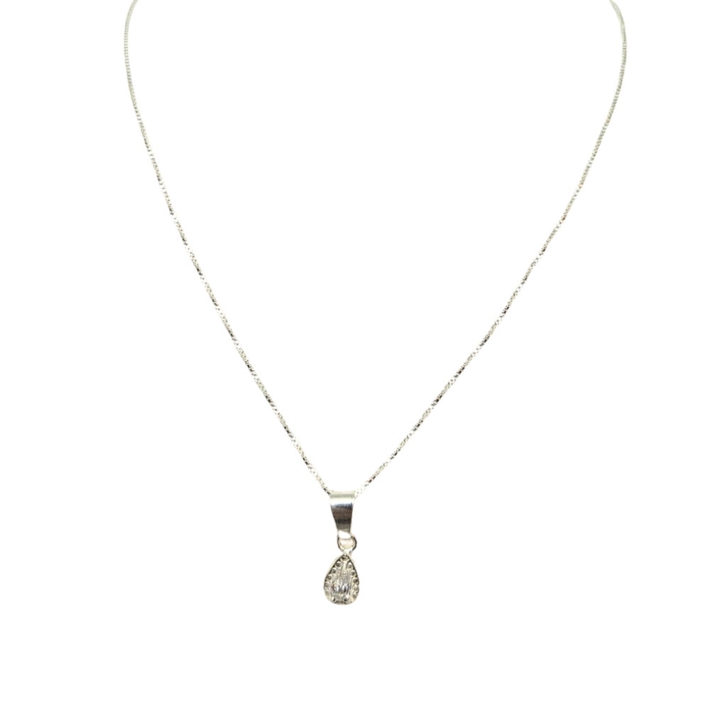Conjunto de Plata 925 compuesto por cadena veneciana y dije en forma de mini gota con cubic engarzado. Un diseño delicado y refinado que aporta un destello sutil, ideal para quienes buscan un accesorio atemporal y elegante. Disponible en cadenas de 40 cm y 45 cm, se adapta a distintos estilos y ocasiones. La cadena veneciana realza la luminosidad del cubic, creando un conjunto armónico y sofisticado.